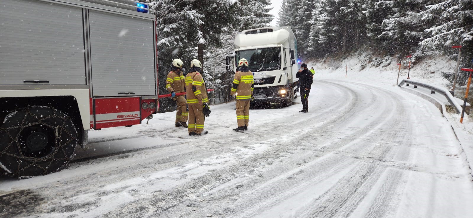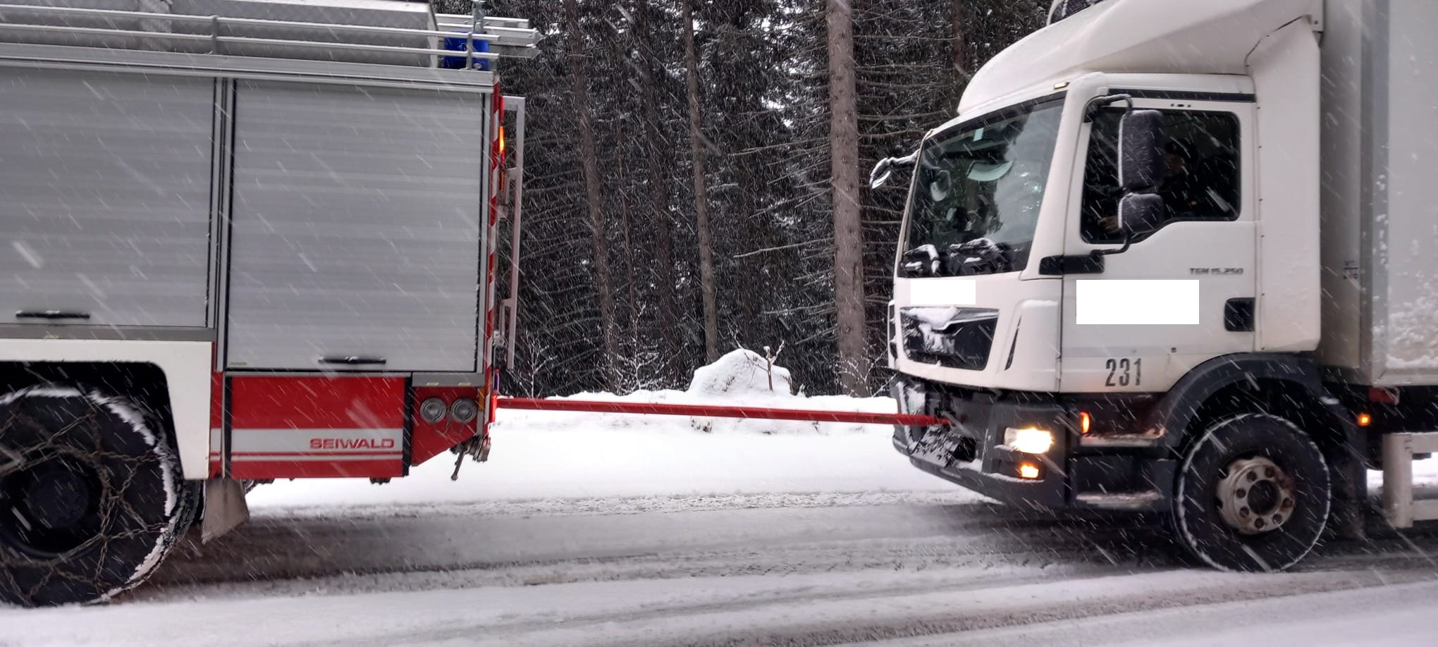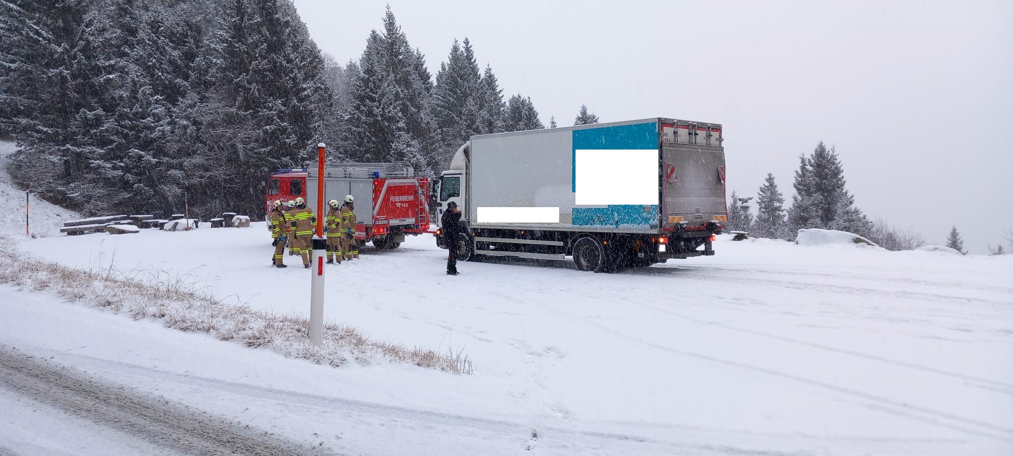 Ein LKW war auf der schneeglatten Fahrbahn im Bereich Schliffern hängen geblieben und konnte ohne Schneeketten nicht weiterfahren.