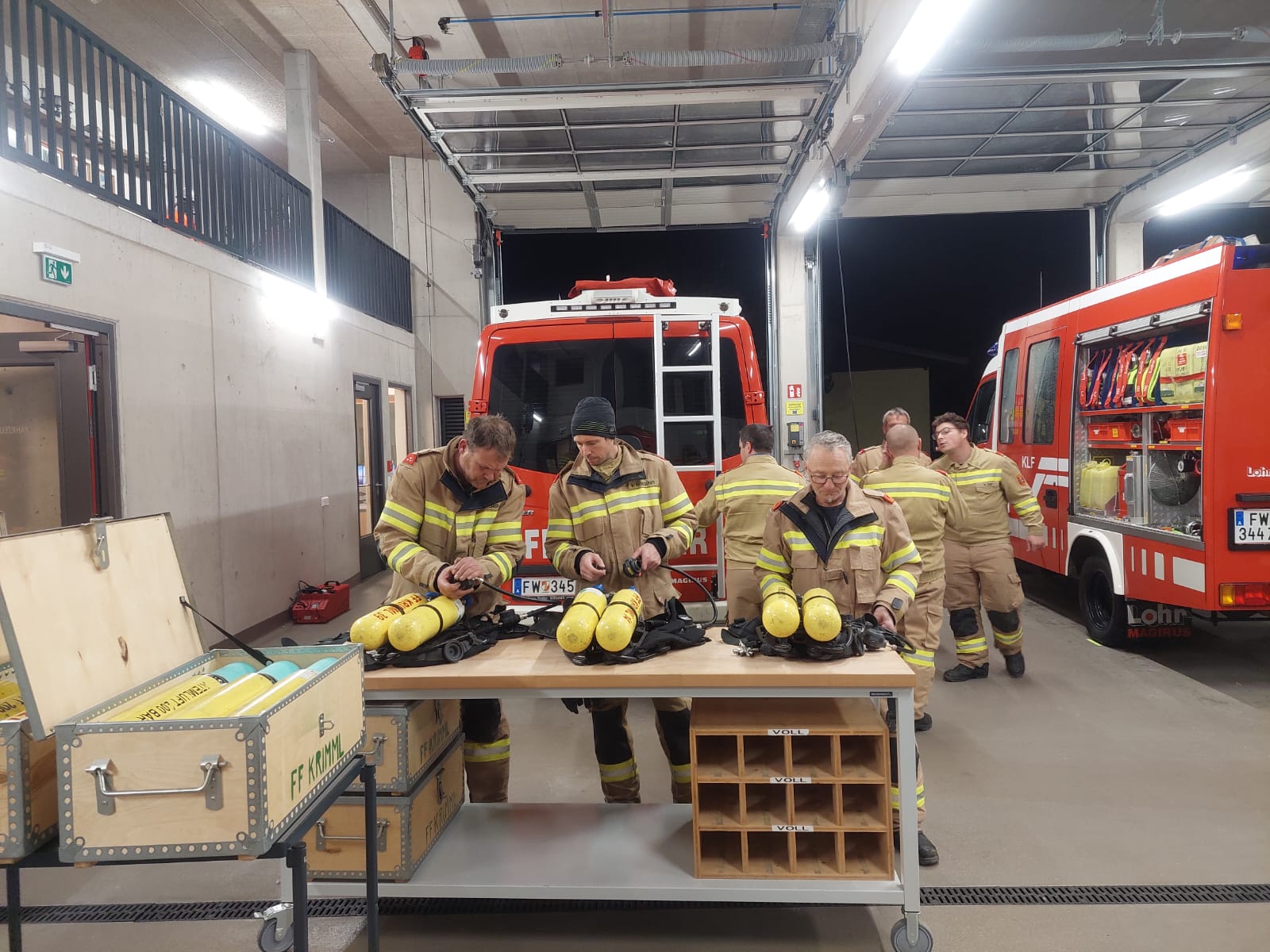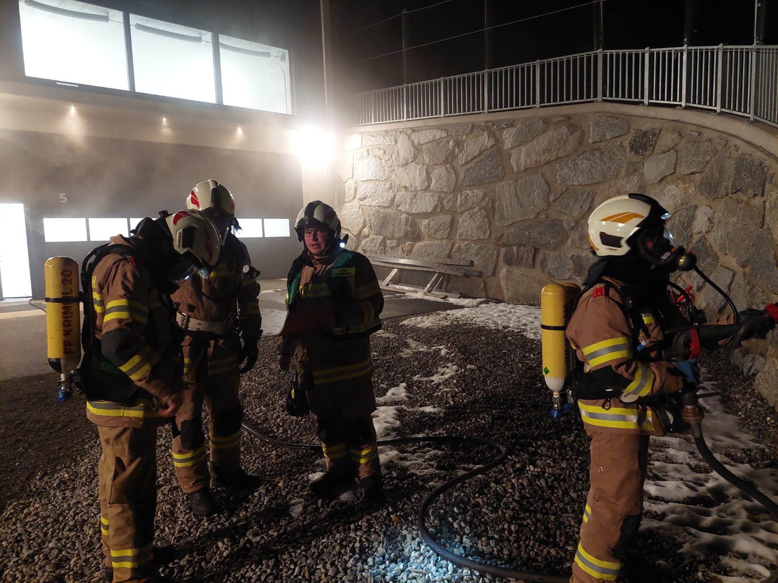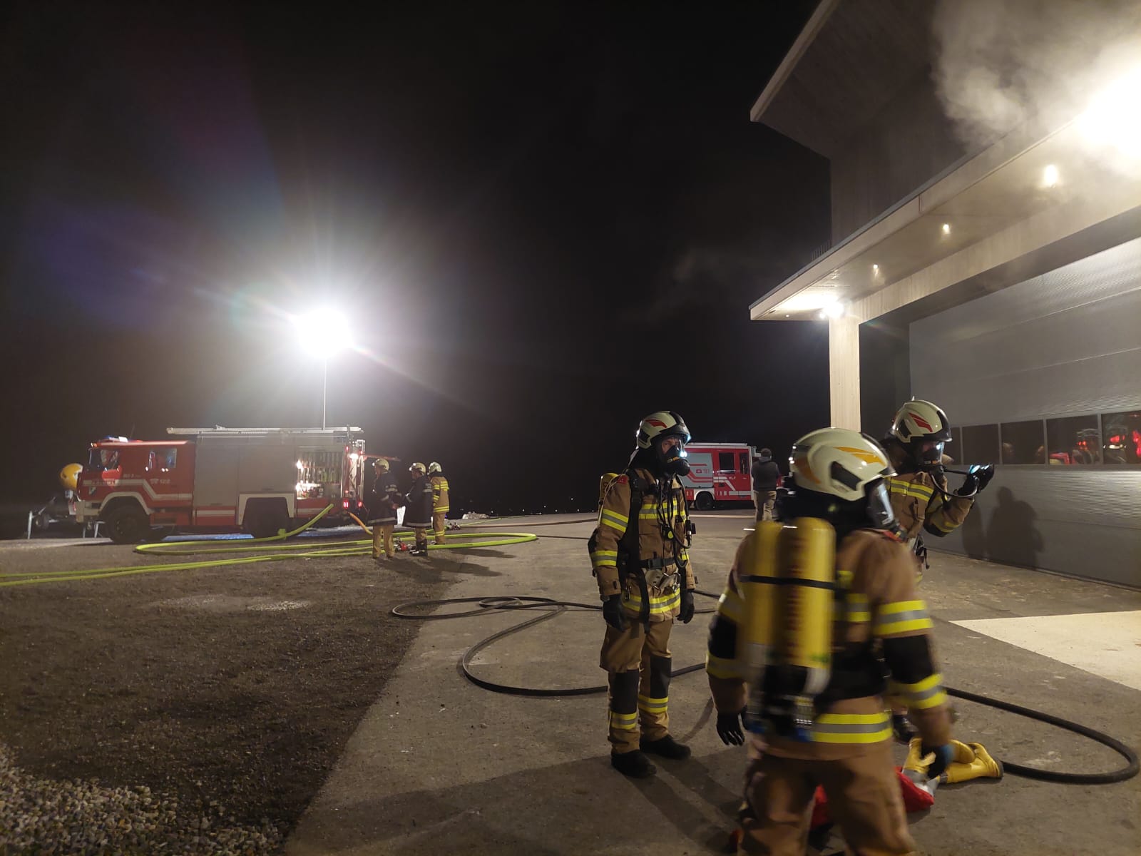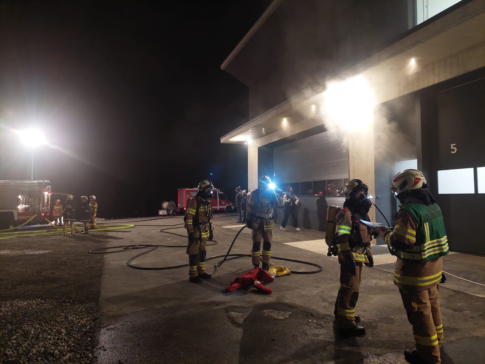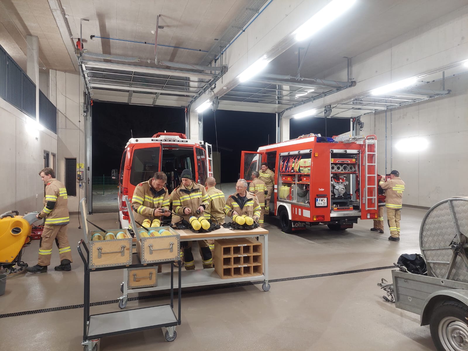 Ein stark verrauchter Garagen- und Werkstattabschnitt, gelagerte Öle sowie Kleinmengen gefährlicher Stoffe – darunter zwei Kanister mit UN-Nummern – und eine vermisste Person im Brandabschnitt waren Übungsannahme.