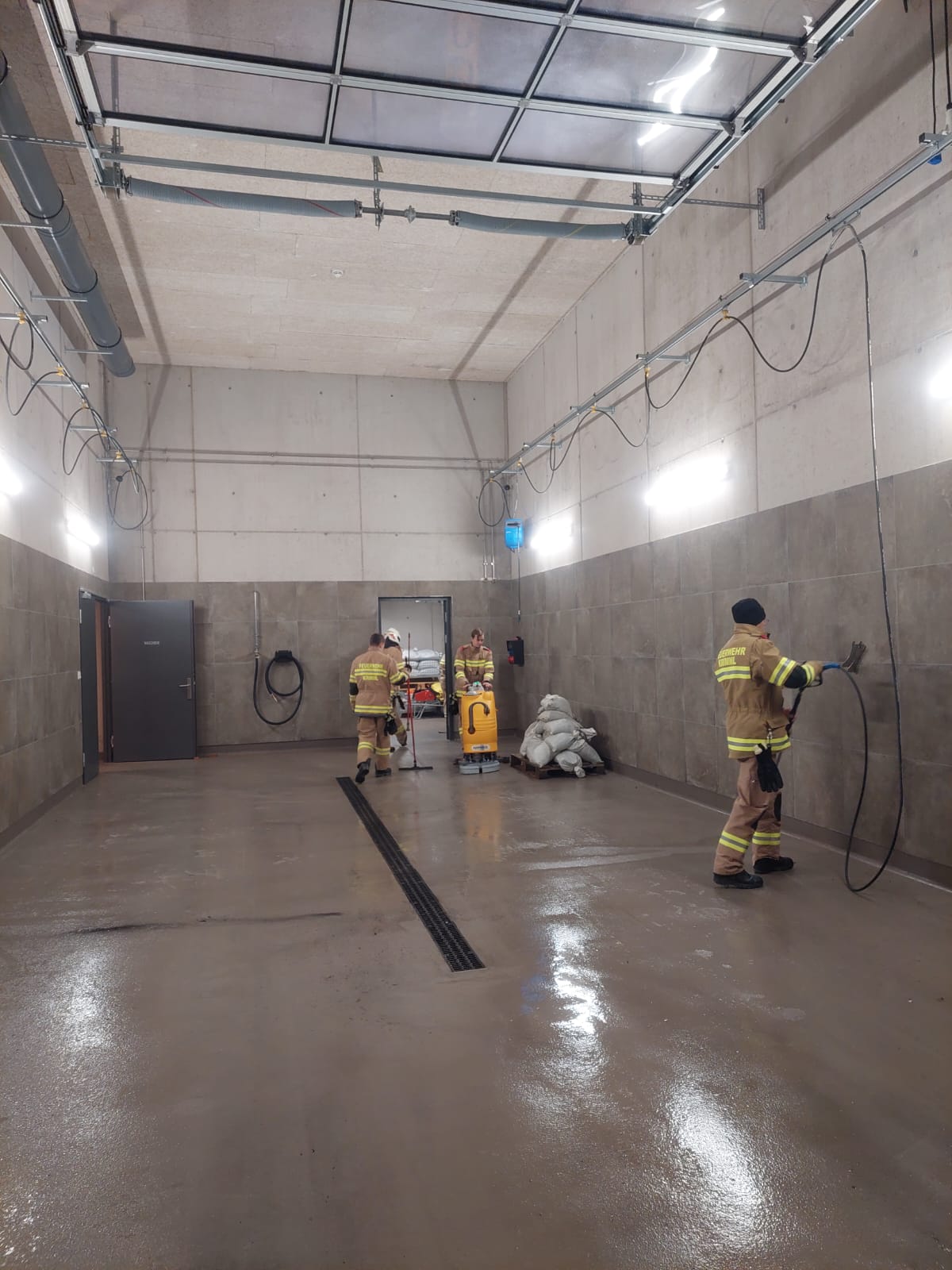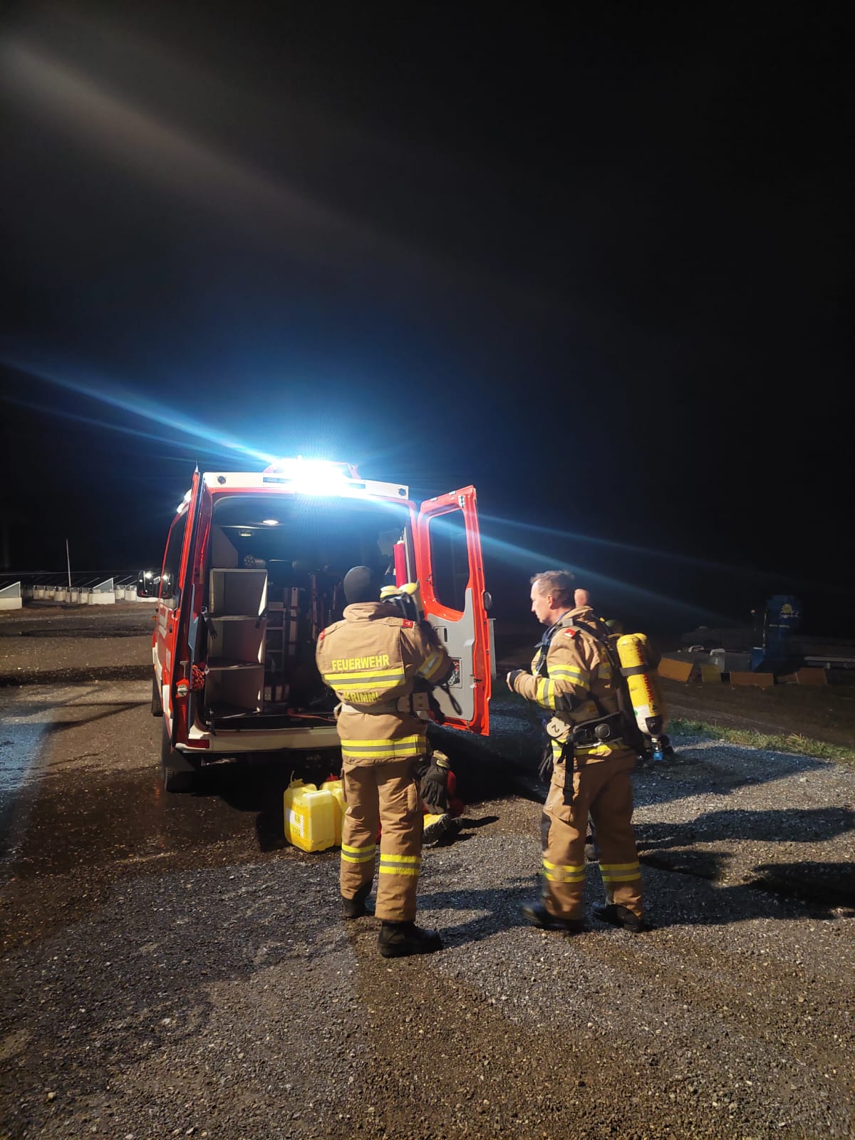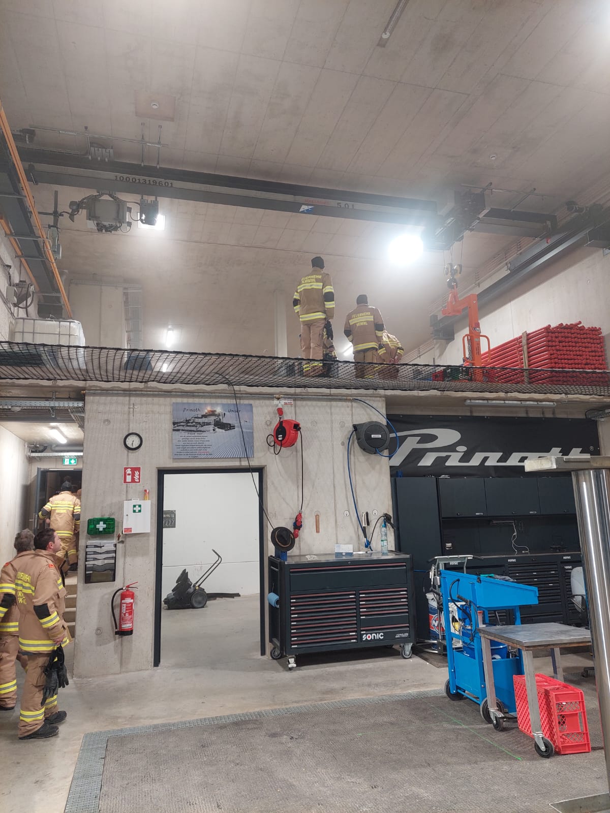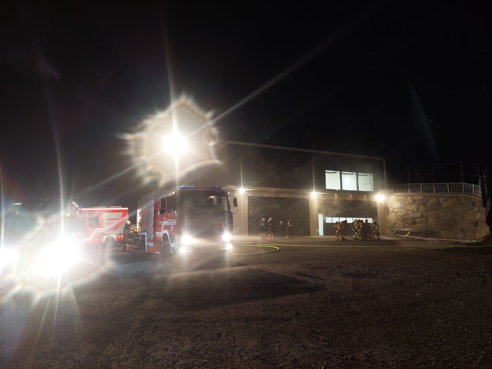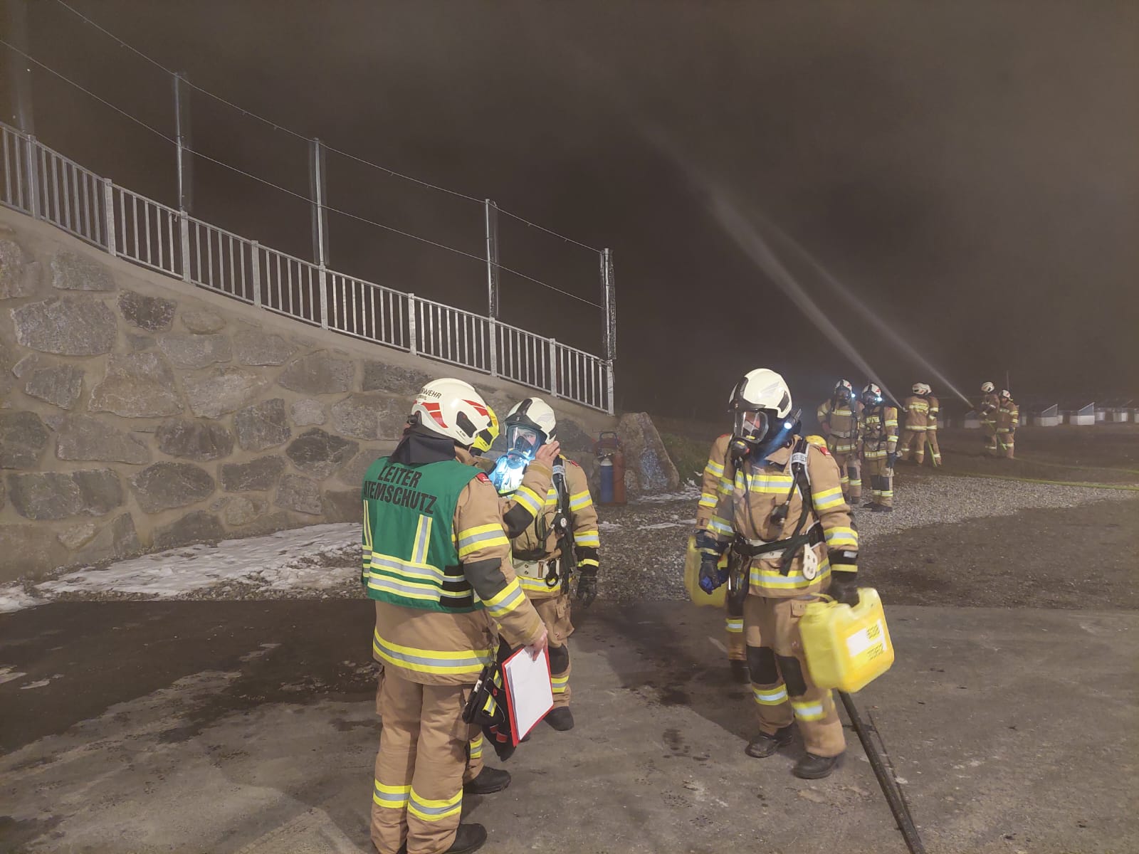Ein stark verrauchter Garagen- und Werkstattabschnitt, gelagerte Öle sowie Kleinmengen gefährlicher Stoffe – darunter zwei Kanister mit UN-Nummern – und eine vermisste Person im Brandabschnitt waren Übungsannahme.
